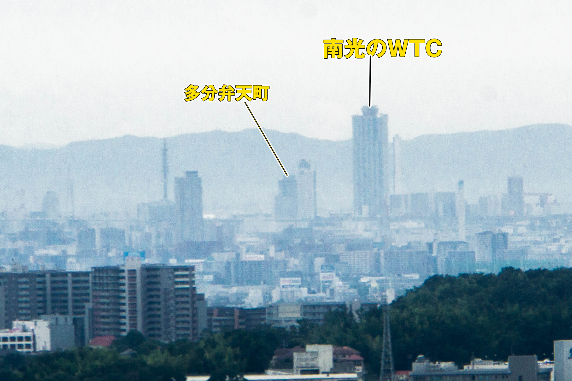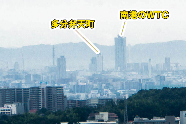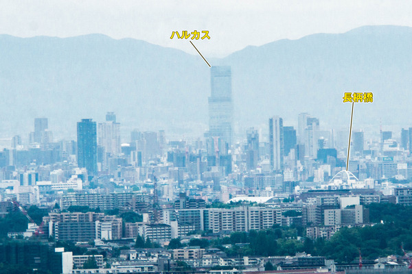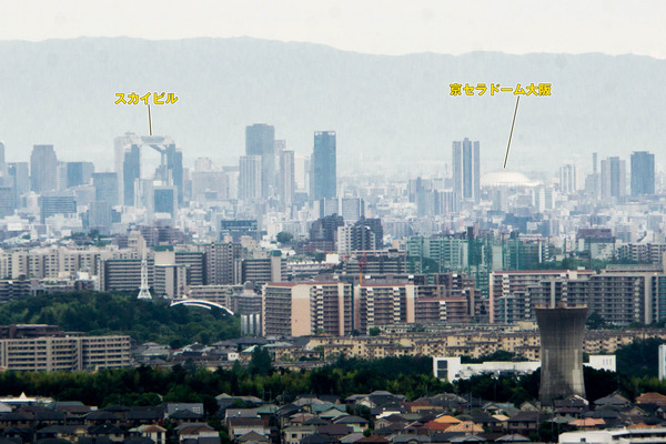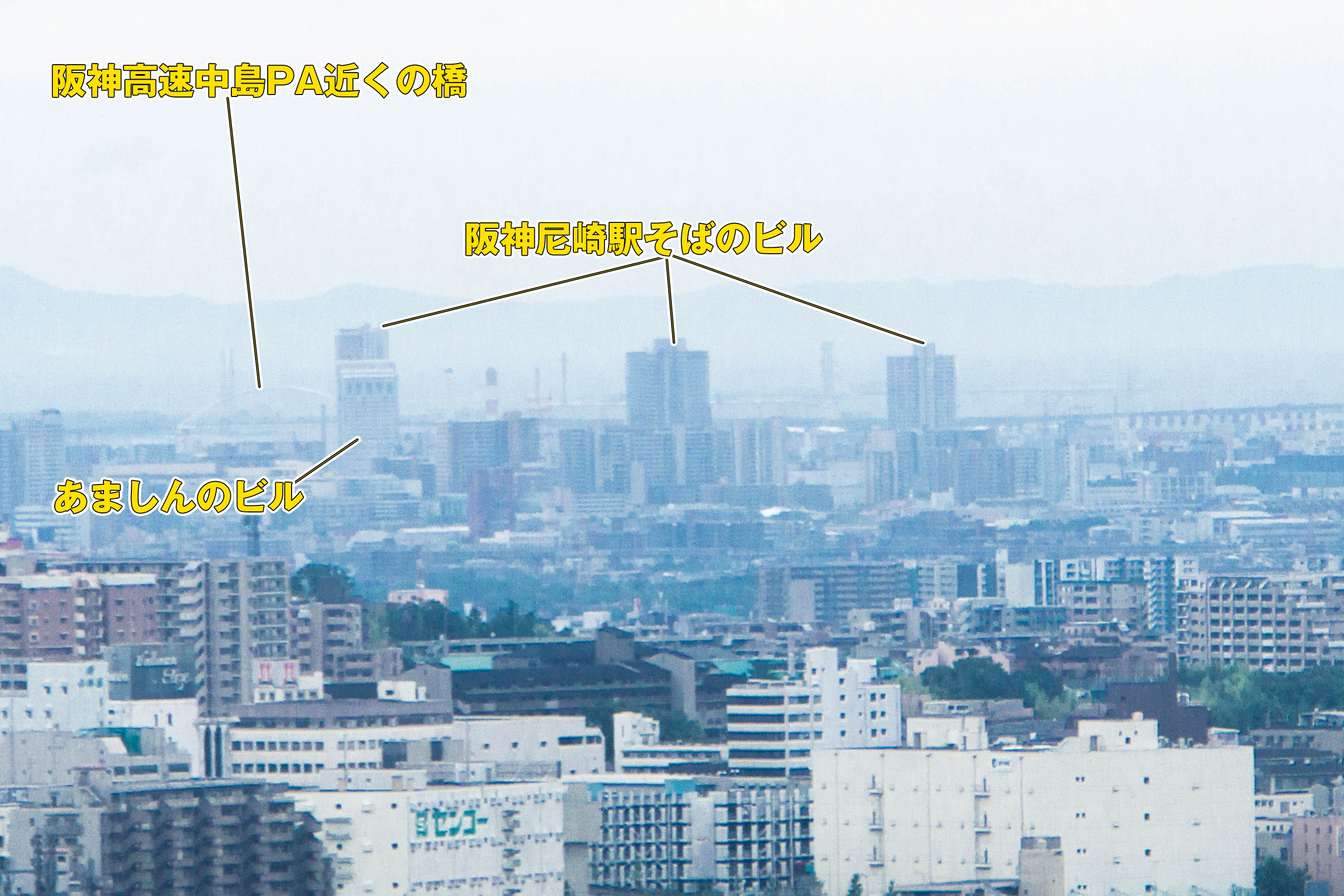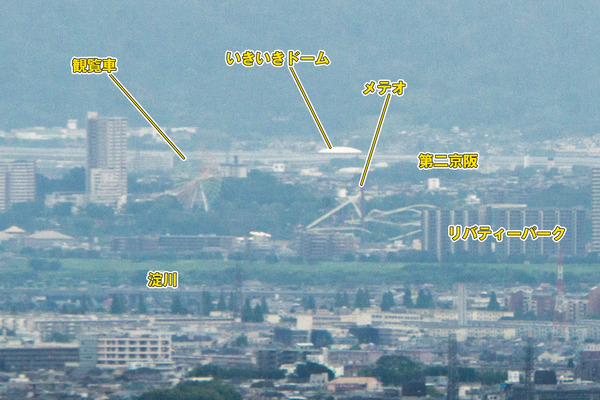 合成しているので手前の手すりがちょっとばぐっています。赤で丸している部分が枚方あたり。ズームしてみるとこんな感じでいろいろ見えます↓