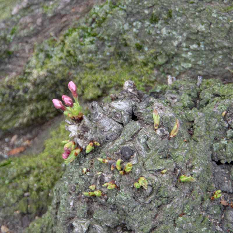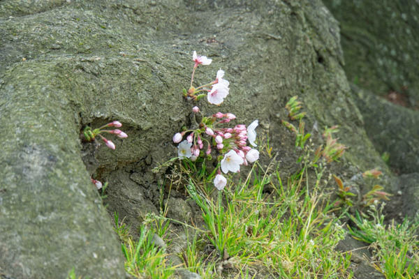 しかし、地面の方に目を向けてみると、根っこから生えている小さな桜の花でほっこり。