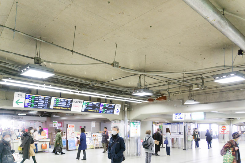 枚方市駅中央改札前の天井がすでに枚方市駅リニューアルのイメージパースっぽくなっています。