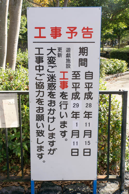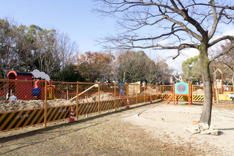 工事のお知らせの張り紙。遊具3基・時計1基を撤去し、遊具3基・時計1基を設置する工事で、見に行った時点では既に撤去が終わり、新たに設置されているようでした。