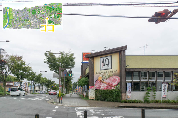 上の写真からみぎを向いて撮影。いろり屋やガソリンスタンドなどがあるところです。
