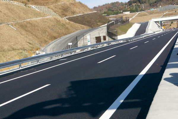 反対車線を見るとこんな感じ。できたての道路の色をしています。