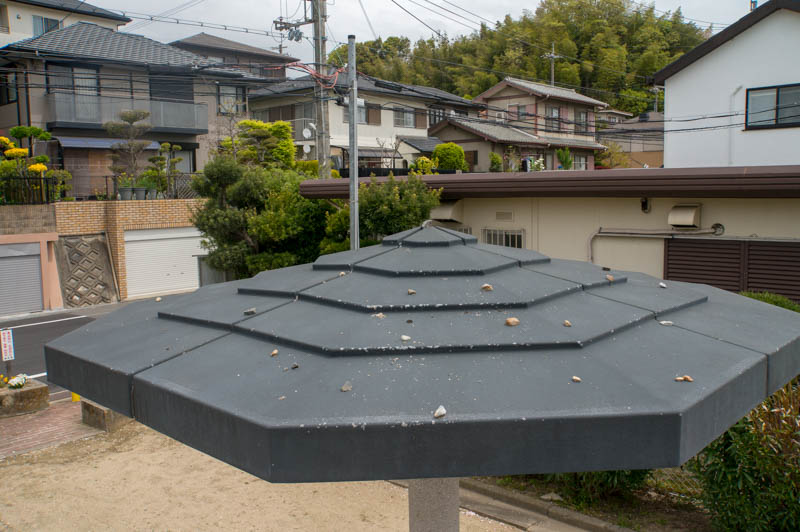 公園の屋根にはなぜか石が綺麗に並べられています。