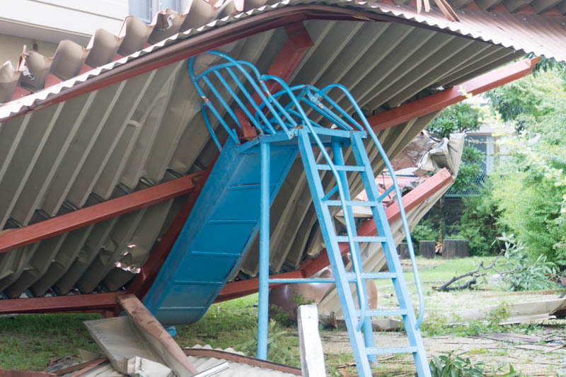 プレハブの屋根っぽいものが大きく歪んでいました。