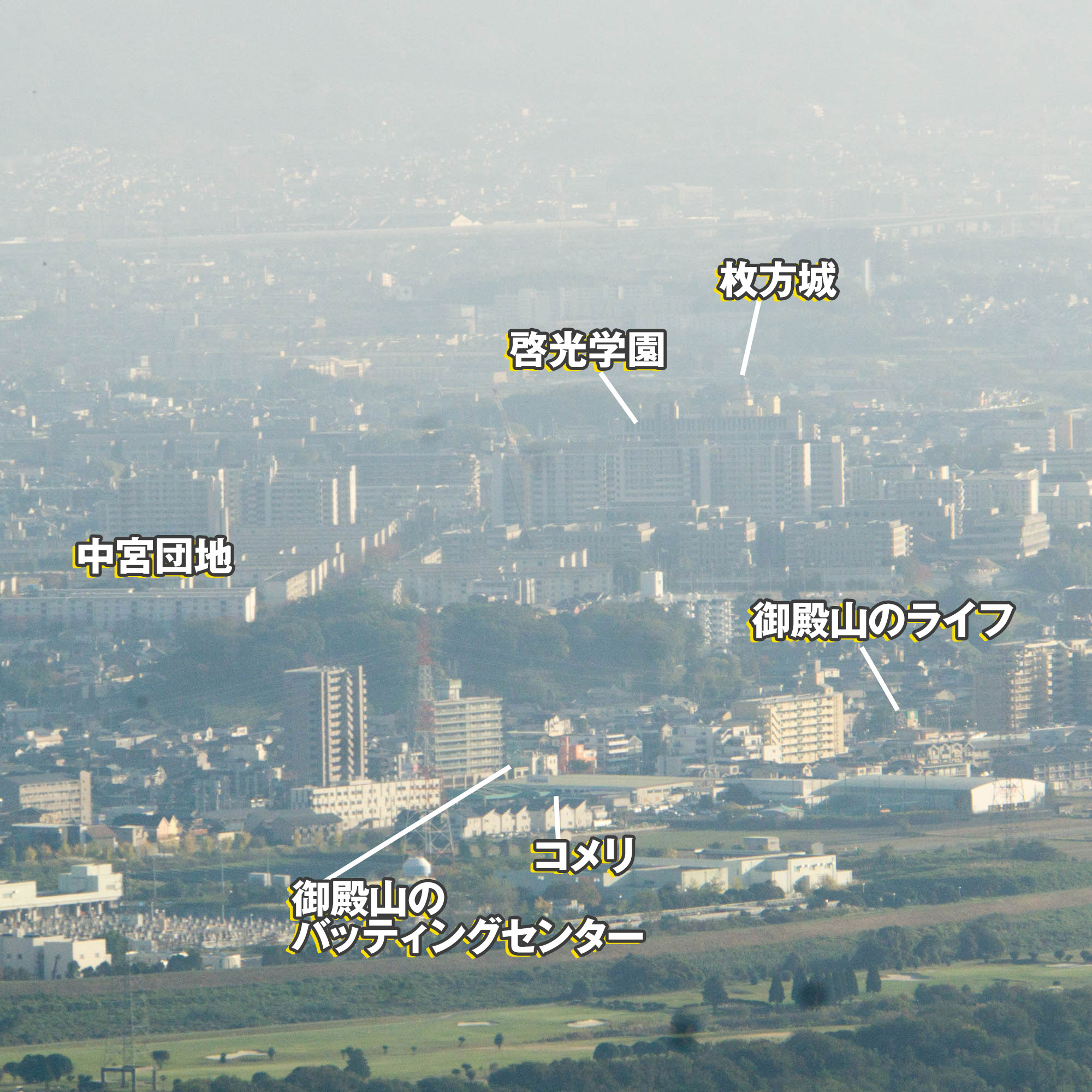 中宮北町のアミティという団地からヒョコッと啓光学園と枚方城が顔を出しているスタイルです。