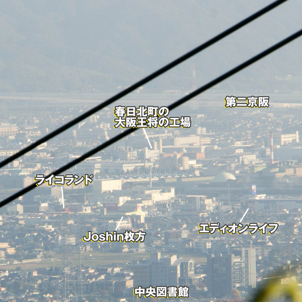 楠葉中や市民の森など、くずはの中でも北側のエリアと、八幡方面。城陽のアルプラが見えているのは驚きでした。
