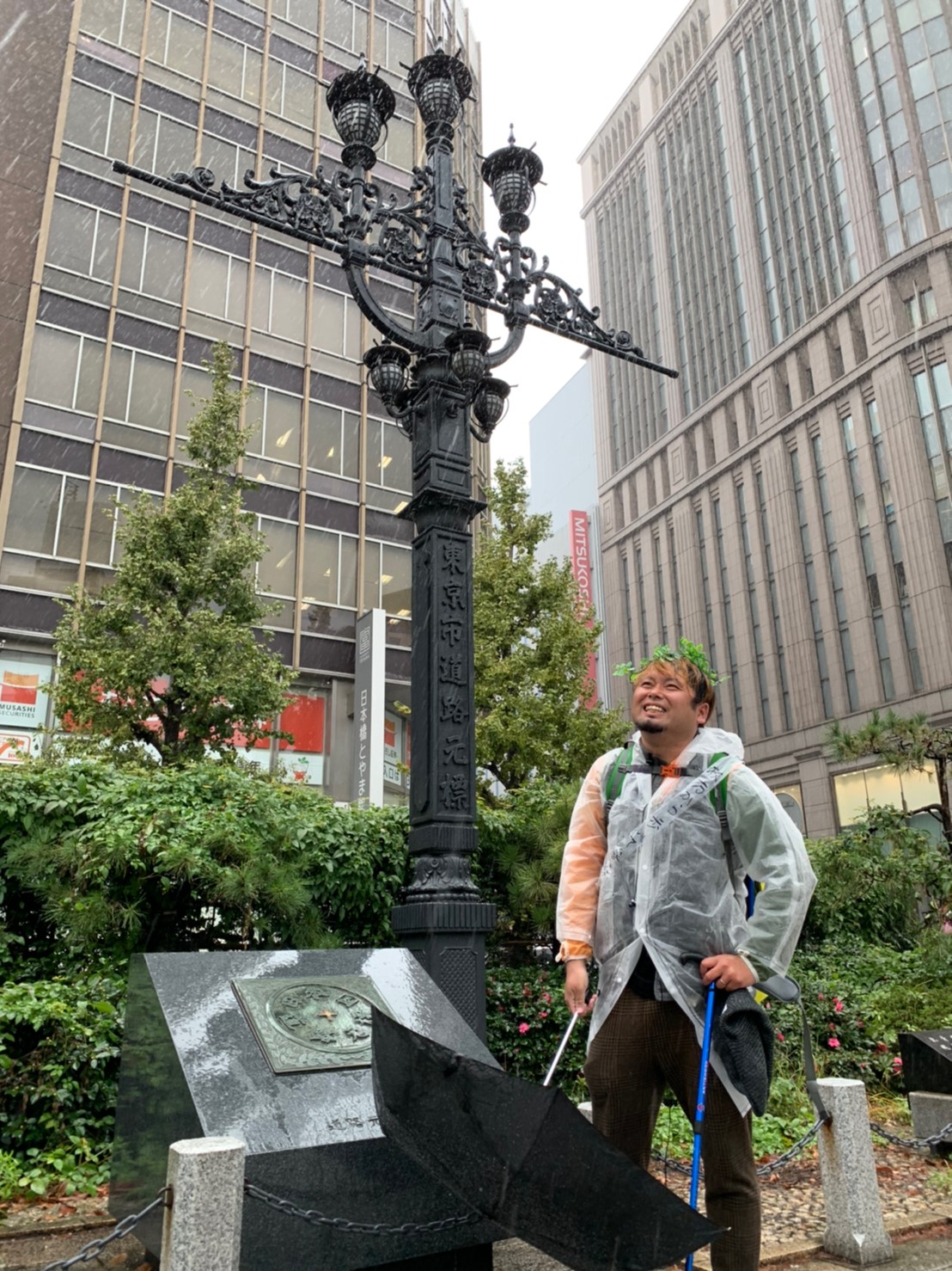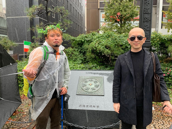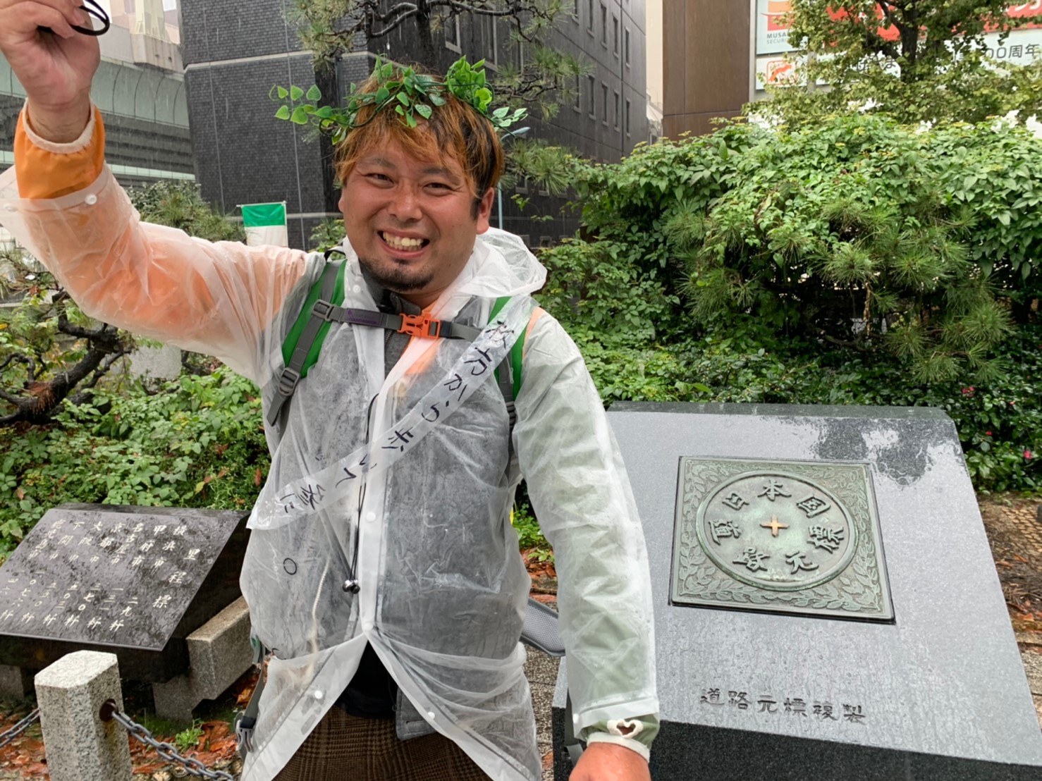 カズマ@ひらつーから、月桂冠っぽい葉っぱと「枚方から歩いて参った」と書かれたタスキをかけられて、日本国道路元標の元で記念写真。