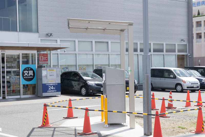 読者さんから、何か工事しててコインパーキングかも、という情報をいただいたので行ってみたところ、返却ボックスが設置されていたので、この位置ならおそらくドライブスルー返却ができる返却ポストだと思われます。