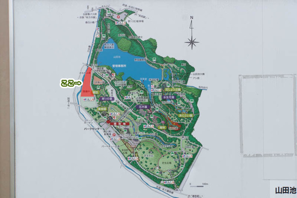 このあたりの場所は以前「ホースフレンズ牧場」が出来るという話がありましたが、流れてしまったそうです。山田池公園内の地図でいうとここ↓