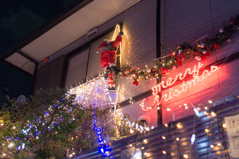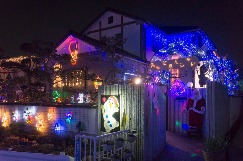 例年すごいことになっているこちらのお家。入口には「入って見んしゃい」という文字とサンタさん。