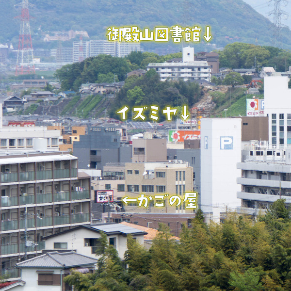 市役所近くのかごの屋に、イズミヤ、そして御殿山方面。御殿山神社周辺の山の存在感が際立っています。