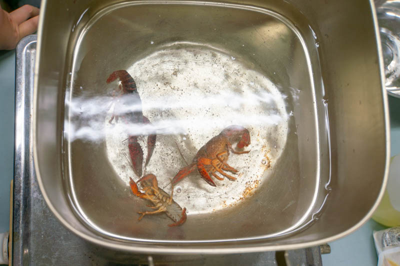 野生のザリガニには寄生虫がいる可能性がありますし、泥臭いのを食べるのではなく、やはり美味しくいただきたいので、生物飼育部の方々に2週間ほどザリガニの泥抜きをしてもらいました。感謝!
